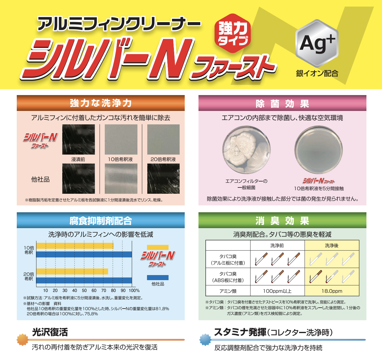 腐食抑制剤配合でエアコン洗浄後、汚れの付着を防ぎ、本来の光沢を復活させます。